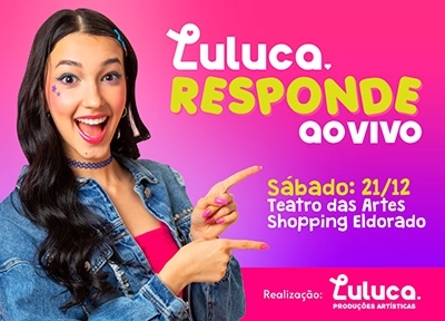Sinopse: Prepare-se para o evento mais esperado! A youtuber Luluca, sucesso absoluto entre o público infantojuvenil, te convida para uma experiência inesquecível no "Luluca Responde ao Vivo". Um encontro repleto de emoção, diversão e muitas surpresas para celebrar o Natal ao lado dos fãs. Imagine poder ver a Luluca ao vivo, ouvir suas histórias, fazer perguntas, curtir momentos especiais de interação e ainda tirar foto com ela! Este é o presente de Natal perfeito para todos os fãs da Luluca, com momentos emocionantes e inesquecíveis para toda a família. Você pode fazer parte deste evento único. Ingressos Limitados!.