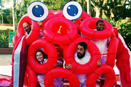 Um dos pontos centrais do espetáculo é a ocupação do espaço público. “Imaginar que podemos encontrar um polvo gigante no meio da rua ou que a rua pode se transformar num grande oceano faz parte da brincadeira de construção de novos imaginários coletivos. É um convite à utopia, à lembrança de que podemos inventar mundos e experiências coletivamente”, afirma Thais.